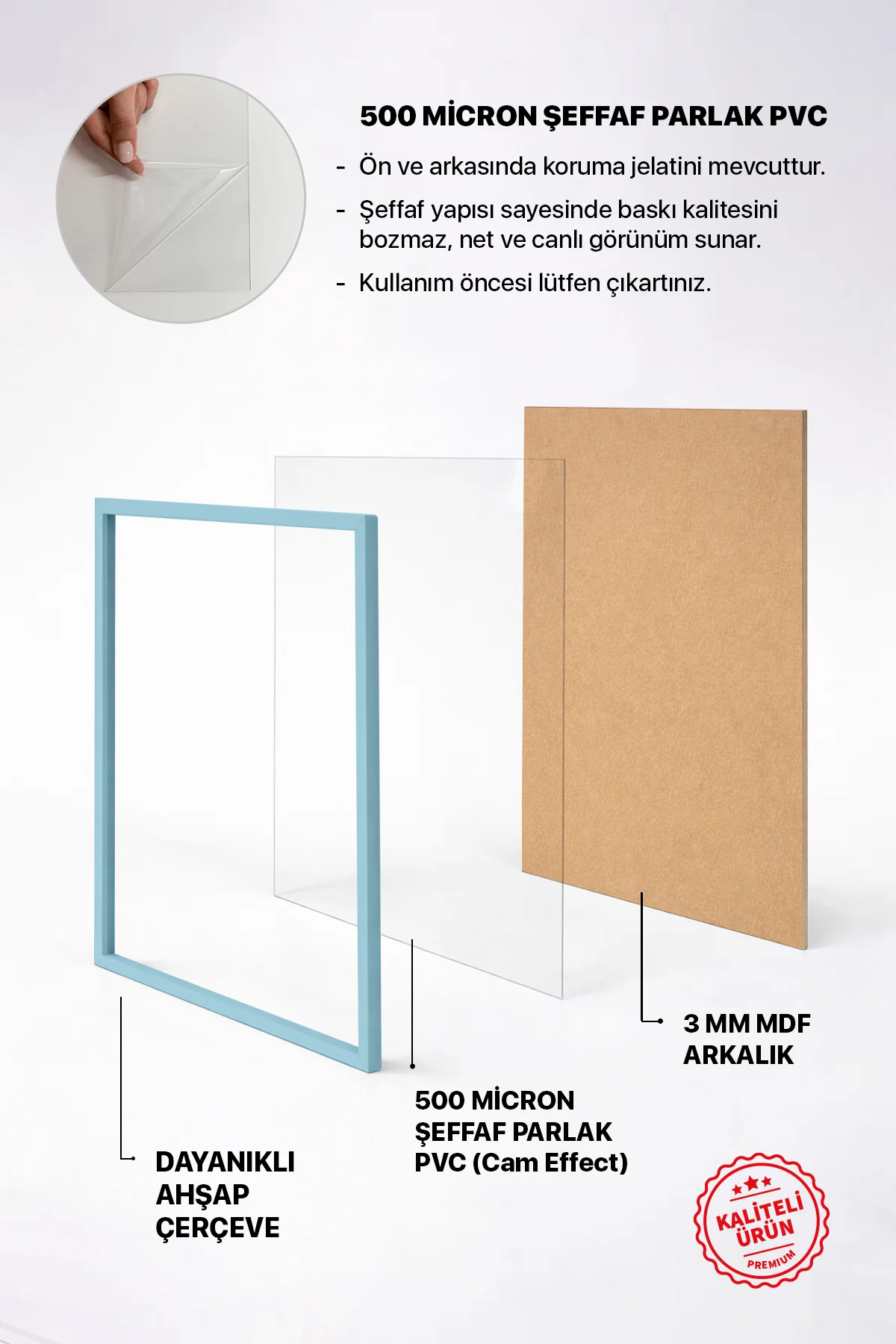 Koruma: 500 mikron kalınlığında iki taraflı koruma jelatinli şeffaf PVC