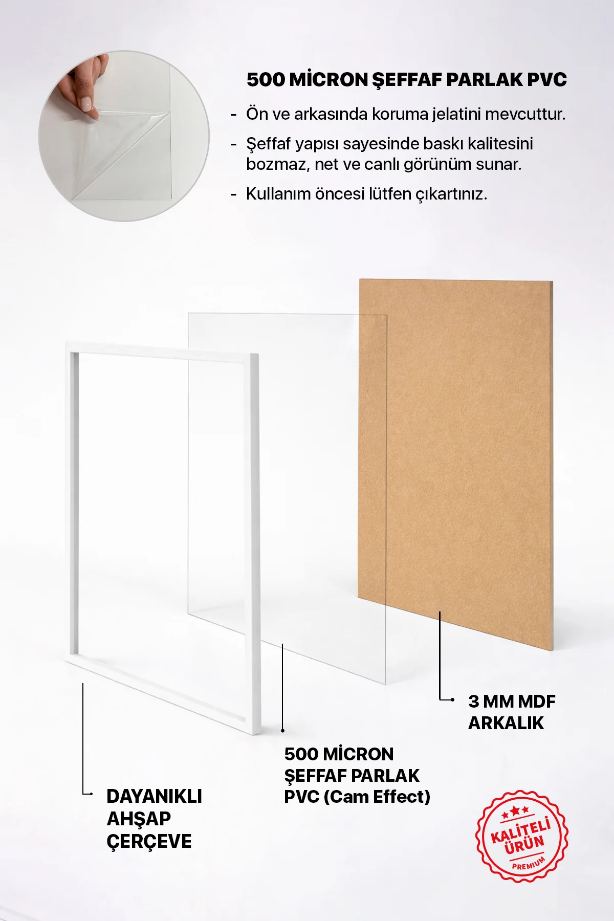 Koruma: 500 mikron kalınlığında iki taraflı koruma jelatinli şeffaf PVC